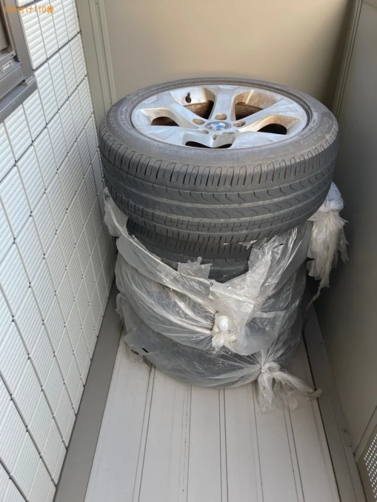 | 担当のコメント | ホイール付き自動車タイヤの処理にお困りのお客様からご相談いただきました。引っ越し前に回収可能なことがご依頼の決め手になったようです。片付け110番では、最短即日お伺いさせていただきます。不用品にお困りの際はまたいつでもご相談ください。 |